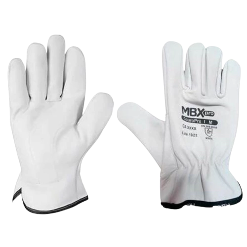 Luvas de segurança para proteção das mãos contra agentes mecânicos. Luva cinco dedos, confeccionada em couro, punho de segurança com elástico e acabamento em debrum. Aplicações: Proteção das mãos contra abrasão, corte, rasgo, perfuração.