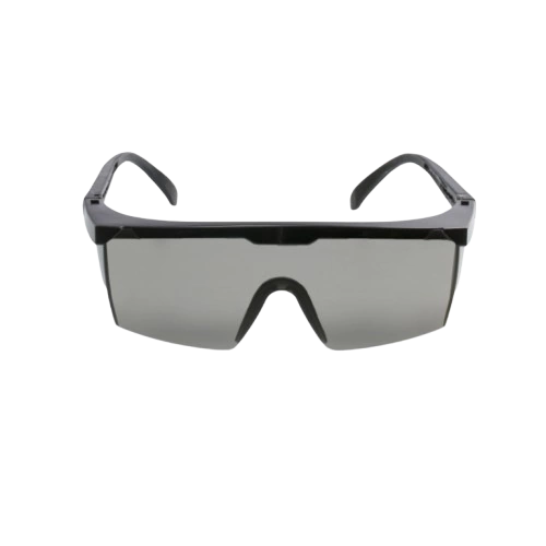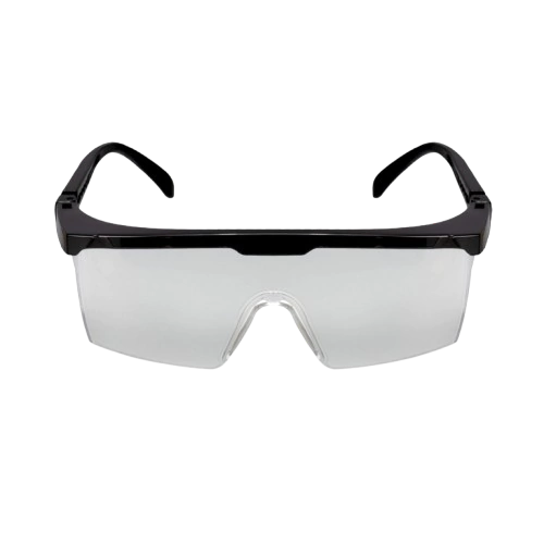 Óculos de proteção, constituídos de arco de material plástico (nylon) com meia-proteção nas bordas, um pino central alfinete e duas fendas nas extremidades da armação utilizadas para o encaixar de visor confeccionado em policarbonato com um furo central para encaixe do pino do arco, apoio nasal e protetor lateral injetado no mesmo material do visor com uma fenda em cada extremidade para o encaixe no arco, hastes do tipo espátula confeccionado do mesmo material que o arco e constituídas de duas peças: semi-haste vazada com uma extremidades presas ao arco por meio de parafuso metálico e outra semi-haste vazada que se encaixa na semi-haste anterior e permite regulagem de tamanho.